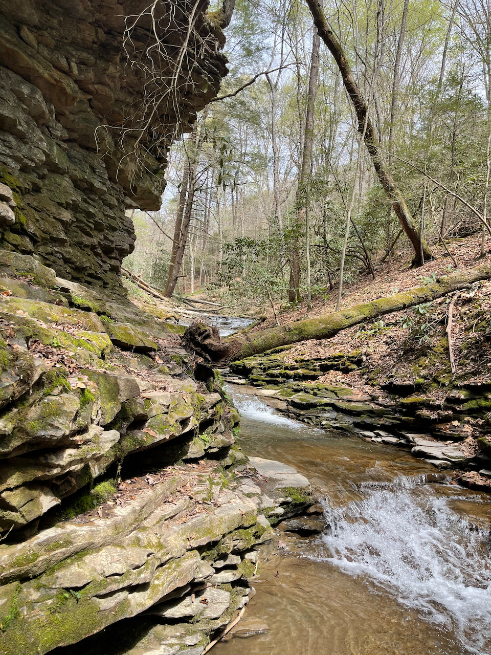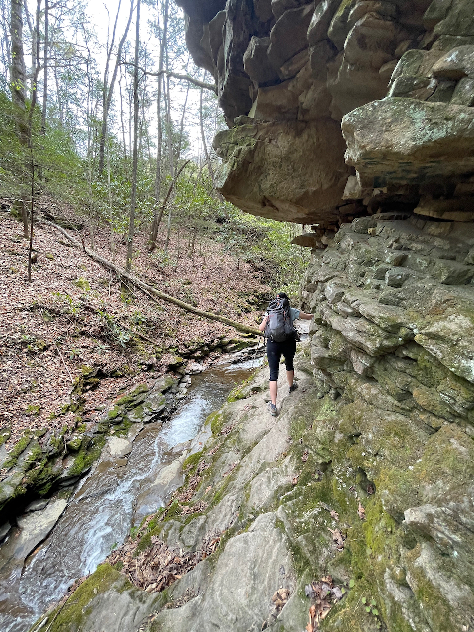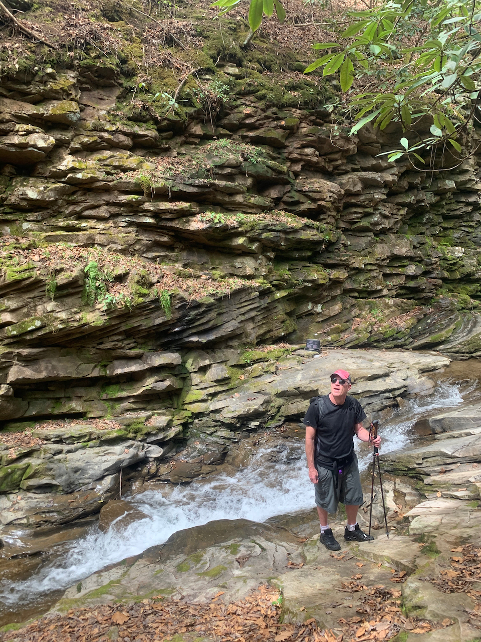 After our visit to Pikeville, we drove upstream to the Russell Fork to appreciate a different kind of beauty. We wanted to see the rapids, so we took a devious path down towards the river through a primitive trail along Center Creek. We scrambled about a half mile or so, past signs that warned of extreme hiking, and into a poorly marked section that was tricky to follow. From there, we hopped and waded across slick rocks and through a tight canyon. The hiking was sporting (a climber’s term for “dangerous”), with delicate scrambles on slanted rocks above the creek. It was beautiful in there, but definitely a place to walk with deliberation.