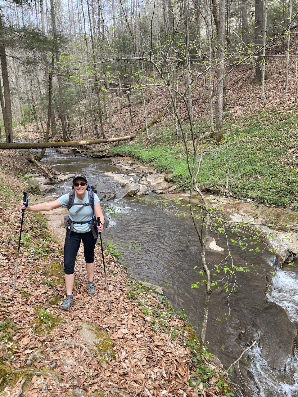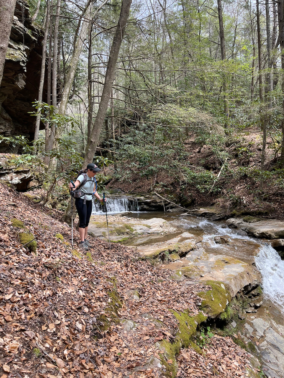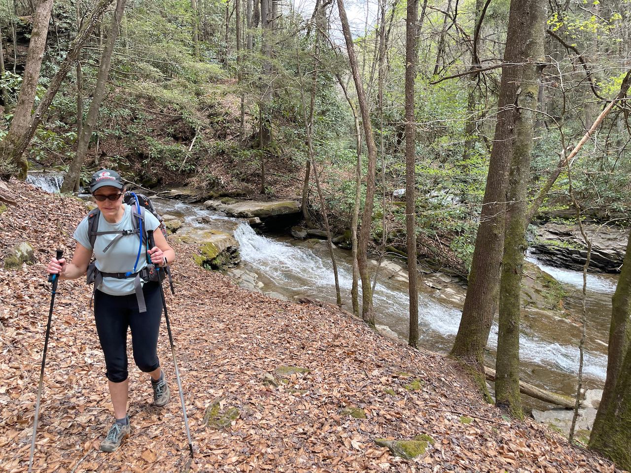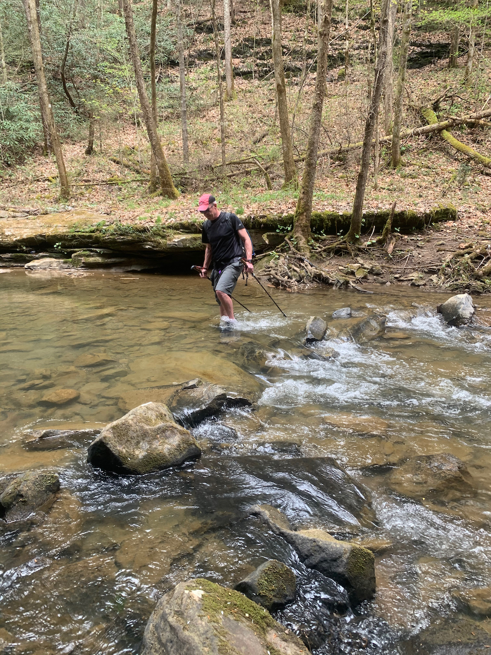 After our visit to Pikeville, we drove upstream to the Russell Fork to appreciate a different kind of beauty. We wanted to see the rapids, so we took a devious path down towards the river through a primitive trail along Center Creek. We scrambled about a half mile or so, past signs that warned of extreme hiking, and into a poorly marked section that was tricky to follow. From there, we hopped and waded across slick rocks and through a tight canyon. The hiking was sporting (a climber’s term for “dangerous”), with delicate scrambles on slanted rocks above the creek. It was beautiful in there, but definitely a place to walk with deliberation.