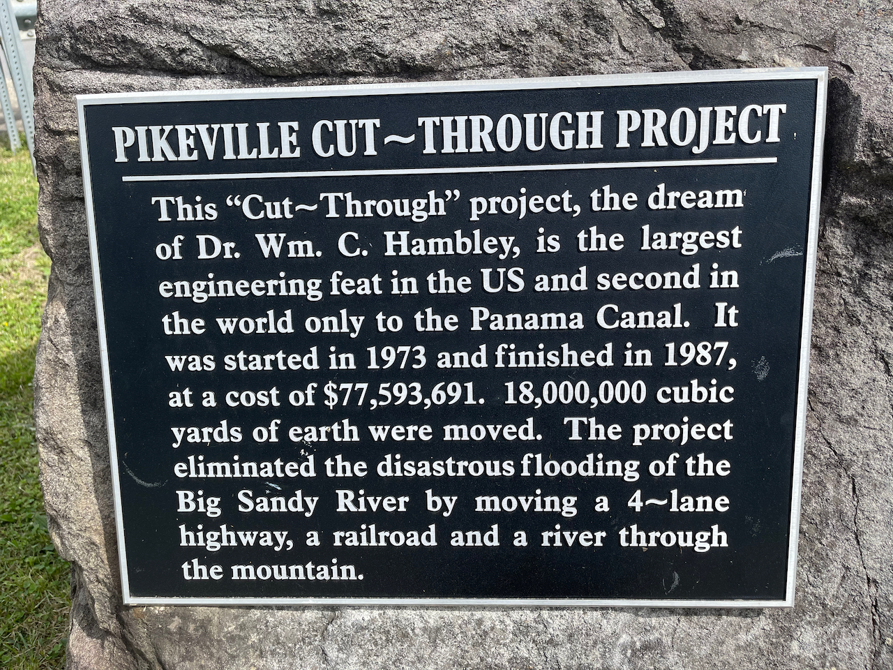 But what drew us to Pikeville wasn’t a family feud or a country musician. Rather, it was a massive engineering project called the Pikeville Cut-Through. Finished in 1987, the Cut-Through re-routes the Levisa Fork of the Big Sandy River (the Russell Fork is a tributary) through a man-made channel in the mountain. Prior to the cut, flooding occurred on an almost annual basis (it was particularly bad in 1977). Much of the land in Pikeville’s central business district was basically unusable.
